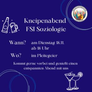 Die FSI Soziologie geht am Dienstag den 18.11. um 18:00 zum Pleitegeier. Kommt gerne auf ein Getränk eurer Wahl vorbei.